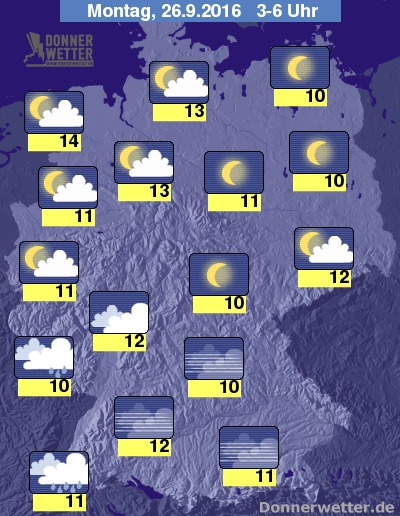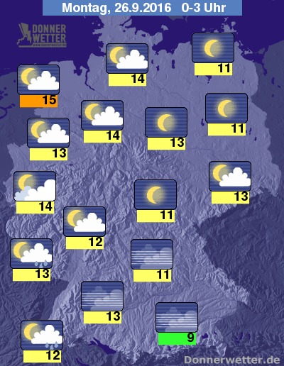 In der Nacht auf Montag nimmt die Bewölkung über der Westhälfte Deutschland häufig zu, Schauer sind zu diesem Zeitpunkt aber meist nur zwischen Oberrhein und Mosel zu erwarten. Im Süden und Osten zeigt sich der Himmel dagegen verbreitet sternenklar, entlang der Donau kann sich regional Nebel bilden.
