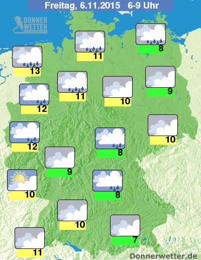 Im Rest der Republik bleibt es bei zunächst überwiegend lockerer Bewölkung trocken. In den frühen Morgenstunden des Freitag nimmt die Bewölkung dann aber vielerorts zu, die Temperaturen liegen dann bei Werten um 13 Grad C im Emden und um 6 Grad C am Alpenrand.