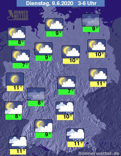 In der Nacht auf Dienstag bleibt der Himmel über dem Norden des Landes locker bewölkt, an der Ostseeküste und im Taunus kann sich gebietsweise auch Nebel bilden. Es bleibt trocken. Südlich des Mains dominiert in den nächsten Stunden starke Bewölkung, aus der im Nachtverlauf auch immer wieder Schauer fallen können.