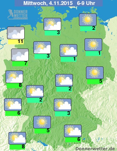 Die Morgenstunden des Mittwoch beginnen vor allem in der Nordwesthälfte mit örtlichen Nebelfeldern. Weiter östlich bestimmt ein Mix aus Sonne und Wolken das Himmelsbild, die Temperaturen liegen am Morgen bei Werten um 1 Grad C im Norden Brandenburgs um 11 Grad in Ostfriesland.