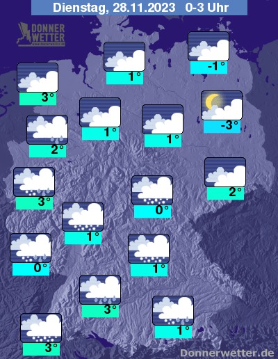 In der Nacht auf Dienstag ist der Himmel über weiten Landesteilen stark bewölkt oder bedeckt. In der Nord- und Osthälfte bleibt es meist niederschlagsfrei, in den übrigen Landesteilen sind in den nächsten Stunden immer wieder Regen-, Schneeregen- oder Schneeschauer möglich.