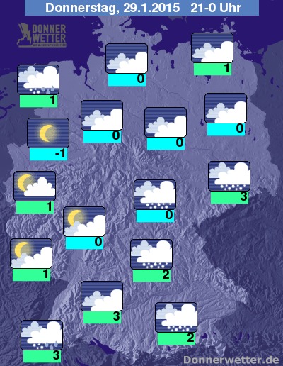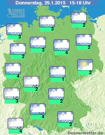 Heute Nachmittag ziehen verbreitet dichte Wolken mit zum Teil kräftigen Schneefällen übers Land, vor allem in den südwestlichen und westlichen Landesteilen fällt dabei auch häufig Regen oder Schneeregen. Es besteht verbreitet Glättegefahr auf den Straßen. Die Temperatur liegt bei 1 Grad im Grabfeld und bis 4 Grad am Oberrhein. Der Wind weht noch oft frisch, teils auch stark mit vereinzelt stürmischen Böen, an Nord- und Ostsee sind einzelne Sturmböen möglich.