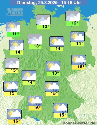 Am Dienstagnachmittag zeigt sich der Himmel über dem Süden und Südosten wechselnd oder stark bewölkt, dabei muss zeitweise mit Schauern und lokalen Gewittern gerechnet werden. Auch im Norden und Nordwesten überwiegt am Nachmittag dichte Bewölkung, es bleibt aber weitgehend niederschlagsfrei. Dazwischen bleibt es bei einem Mix aus Sonne und Wolken trocken.