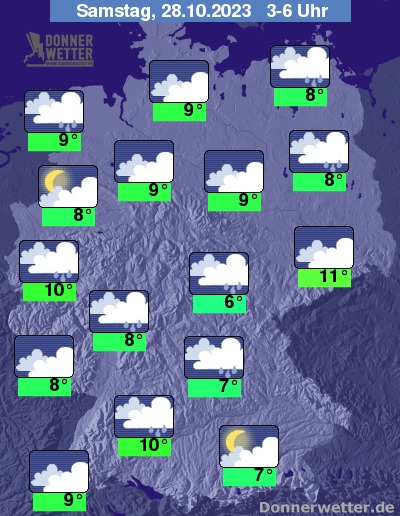 Am Samstag ist es aufgelockert oder dicht bewölkt, dabei bilden sich gebietsweise Schauer. Im Süden bilden sich nur vereinzelt Schauer. Die Temperatur steigt auf 11 Grad in Erfurt und bis 15 Grad n Stuttgart.