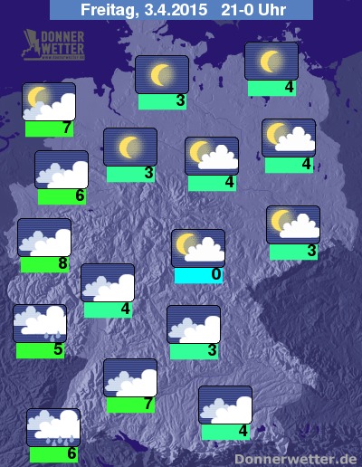 In der Nacht zum Samstag hält sich in der Südwesthälfte von Deutschland weitgehend dichte Bewölkung, dazu fällt immer wieder Regen, vor allem im Süden auch häufig Schneeregen oder teils Schnee. Im Osten und Nordosten zeigt sich der Himmel größtenteils sternenklar, in den übrigen Regionen ist es wechselnd bis stark bewölkt, aber trocken. Die Tiefstwerte liegen bei 5 Grad im Breisgau und -2 Grad im Coburger Land.
