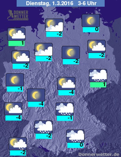 In der Nacht zum Dienstag fällt im süddeutschen Raum, sowie in Sachsen weiterhin immer wieder Schnee, dabei kann es erheblich glatt auf den Straßen werden! Weiter nach Norden und Westen zeigt sich der Himmel dagegen meist locker bewölkt oder auch sternenklar und es bleibt trocken. Die Temperatur sinkt auf 1 Grad an der Nordsee und bis -4 Grad am Westerwald.