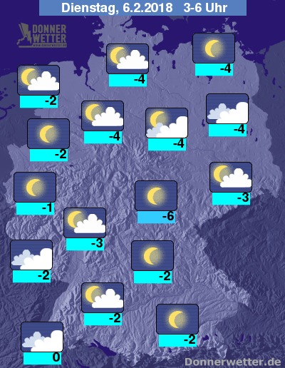 In der Nacht zum Dienstag zeigt sich der Himmel oft sternenklar. Mehr und auch dichtere Wolken halten sich über dem Osten und Südwesten Deutschlands, sonst ist es meist locker bewölkt. Es bleibt überall trocken bei Tiefstwerten zwischen 0 und -6 Grad.