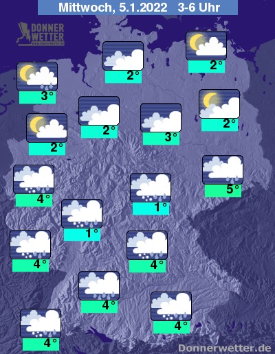 In der folgenden Nacht lockert es im Norden gebietsweise auf, sonst bleibt es verbreitet bedeckt und über der Südhälfte fällt immer wieder Regen, der bis zum Morgen immer mehr auch in Schneeregen oder Schnee übergeht. Weiter nach Norden hin bleibt es größtenteils trocken. Die Temperatur sinkt auf 4 Grad am Oberrhein und etwa 1 Grad im Thüringer Becken.