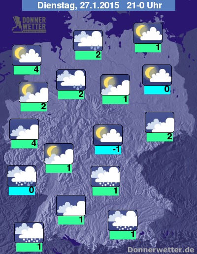 Heute Abend ist es besonders im Süden meist dicht bewölkt und es fällt zeitweise Schnee oder Schneeregen, aber auch sonst ist es oft stark bewölkt, wobei nur hier und da etwas Schnee, Schneeregen oder Regen fällt, dabei besteht Glättegefahr. Häufig aufgelockert bewölkt und trocken bleibt es sowohl im Nordwesten als auch im Nordosten des Landes. Die Abendtemperatur liegt bei 4 Grad in Cuxhaven und um -1 Grad im Vogtland.