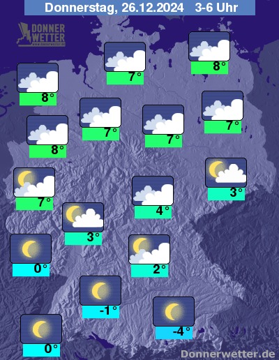 In der Nacht auf den 2. Weihnachtsfeiertag klart es im Süden weiter auf. Auch über der breiten Landesmitte kann es hier und da auflockern. Bedeckt bleibt es aber im Norden Deutschlands. Im Umfeld der Ostsee ist etwas Regen möglich, sonst bleibt es trocken. Die Temperatur sinkt auf 8 Grad in Vorpommern und bis teils -4 Grad in Oberbayern.