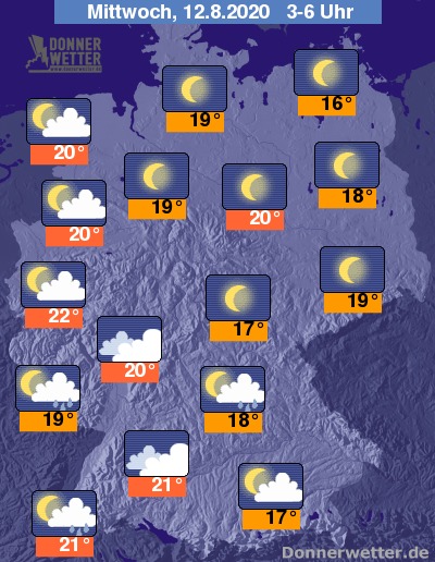 Bis zu den Frühstunden kühlt die Luft auf 16 bis 20 Grad ab, im Südwesten und Westen gibt es teilweise wieder eine tropische Nacht mit Temperaturen oberhalb der 20 Grad - Marke.