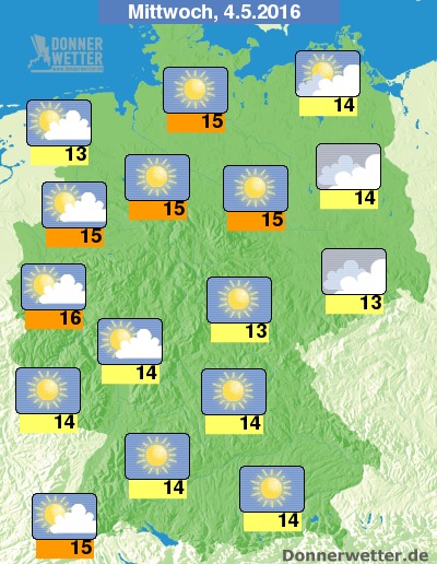 Am Mittwoch ist es im Osten und Nordosten Deutschlands oft stark, gebietsweise aber auch aufgelockert bewölkt, dazu bleibt es meist trocken. Besonders im Süden herrscht weitgehend sonniges Wetter. Im übrigen Bundesgebiet ist es verbreitet heiter bis sonnig und dabei bleibt es trocken. Die Temperatur steigt auf 13 Grad in Dresden und bis etwa 16 Grad in Bonn.