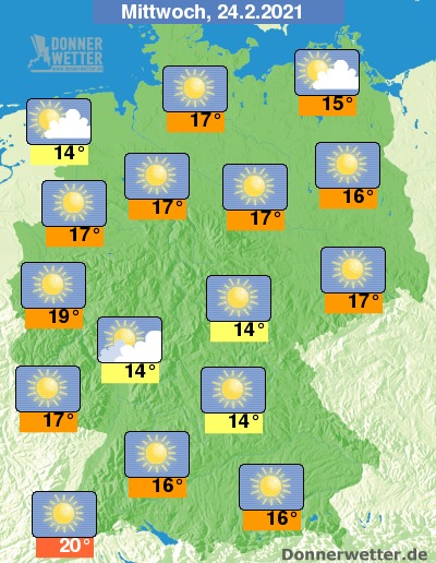 Am Mittwoch ist es verbreitet sonnig, im Küstenumfeld sind hier und da einige Wolken unterwegs, es bleibt aber überall trocken. Die Höchstwerte erreichen 14 Grad im Eichsfeld und bis zu 20 Grad im Breisgau.