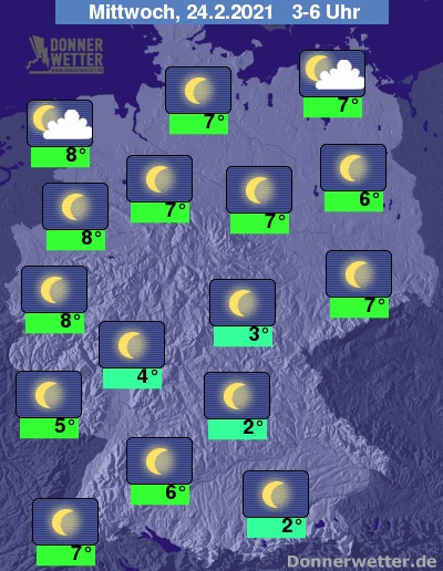 In der Nacht zum Mittwoch ist es rund um die Küsten oft locker oder wechselnd bewölkt, im übrigen Bundesgebiet ist es aber sternenklar. Es bleibt landesweit trocken bei Tiefstwerten von 8 Grad an der Ems und bis etwa 2 Grad im Berchtesgadener Land.