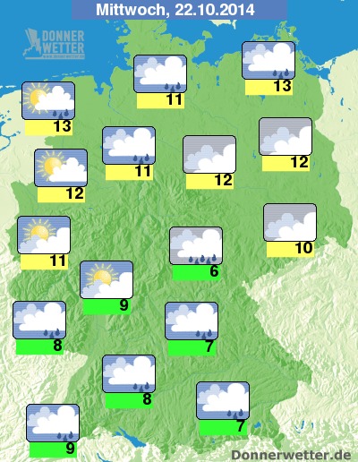 Am Mittwoch ziehen ebenfalls meist dichte Wolken durch, gebietsweise kann sich aber auch die Sonne zeigen. Es bilden sich einzelne, teils kräftige Schauer, häufig bleibt es auch trocken. Es weht ein meist frischer, zeitweise auch starker und in Böen steifer bis stürmischer Wind. Auf den Bergen und an der See sind noch Sturmböen möglich. Die Temperatur steigt nur auf herbstlich kühle 6 bis 13 Grad.
