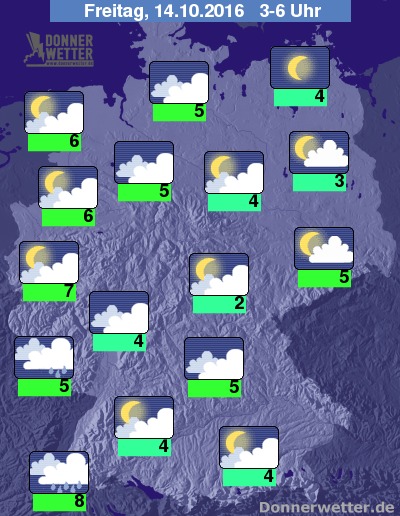 In der Nacht ist vor allem im Schwarzwald mit anhaltendem Regen zu rechnen, im Rest des Landes reißt die Wolkendecke etwas auf. In Ostseenähe wird es sogar sternenklar. Unter sternenklarem Himmel liegen die Tiefstwerte nur knapp über dem Gefrierpunkt.