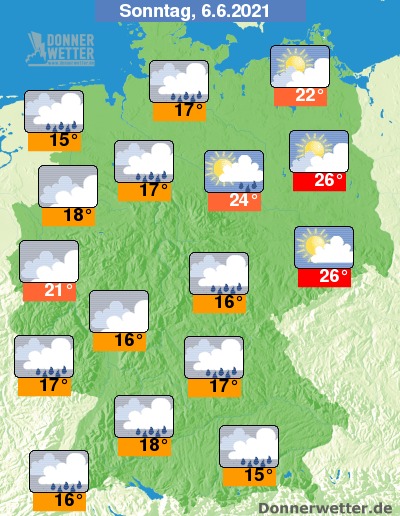 Am Sonntag zeigt sich der Himmel über weiten Landesteilen stark bewölkt oder es ist bedeckt und vor allem im Nordwesten und südlich des Mains muss immer wieder mit Schauern und lokalen teils kräftigen Gewittern, örtlich mit Starkregen einhergehend, gerechnet werden. Überwiegend trocken und freundlich bleibt es am Sonntag östlich der Elbe.