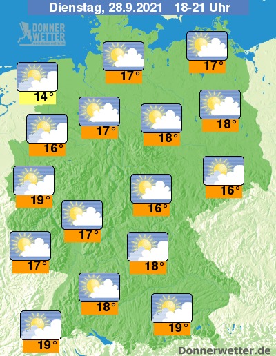 Heute Abend zeigt sich das Wetter teils aufgelockert, häufig ist es aber auch stark bewölkt, dabei bleibt es überall trocken. Die Temperatur liegt bei 14 Grad in Cuxhaven und etwa 19 Grad in München.