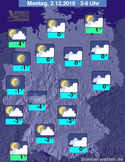 In der Nacht zum Montag ist es über der Westhälfte der Republik anfangs noch meist stark, im Nachtverlauf dann aber meist nur locker bewölkt und oft sogar sternenklar. Weiter nach Osten hin bleibt die Wolkendecke oft verschlossen, aber auch hier kann es zwischendurch auch etwas auflockern. Es bleibt weitgehend trocken bei Tiefstwerten von 4 Grad in Wilhelmshaven und bis -4 Grad am Taunus.