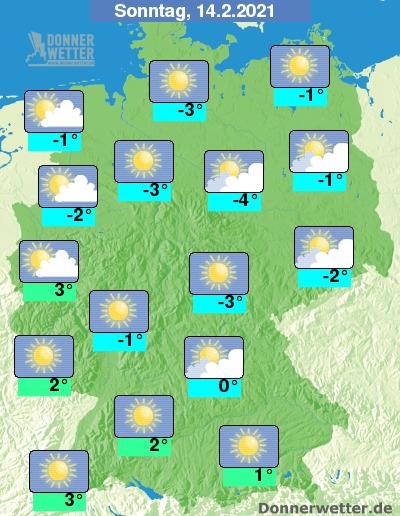 Am Sonntag ist es wieder verbreitet heiter oder sonnig, hier und da können aber auch einige Wolken durchziehen, dabei bleibt es trocken. Die Temperatur erreicht nur -4 Grad in Magdeburg und bis 3 Grad in Köln und Freiburg.