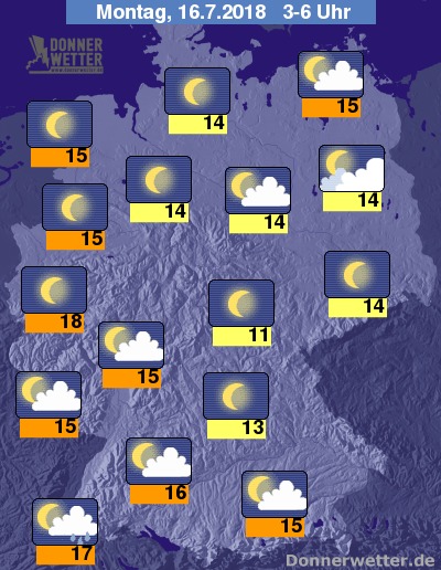 In der folgenden Nacht ist es über dem Südwesten oft stark bewölkt, dabei sind hier noch vereinzelte Schauer und Gewitter möglich. Im Osten und Nordosten sind auch teils mehr Wolken möglich, dazu bleibt es aber trocken. Im übrigen Bundesgebiet ist es hingegen verbreitet sternenklar oder locker bewölkt und dazu trocken. Die Temperatur sinkt auf 18 Grad in Bonn und bis 11 Grad im Vogtland.