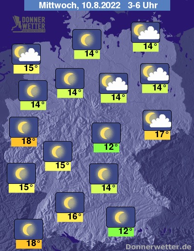 In der folgenden Nacht ist es überwiegend sternenklar, vor allem im Osten und Nordosten ziehen auch lockere Wolkenfelder durch. Es bleibt bundesweit trocken bei Tiefstwerten von 18 Grad in Köln und etwa 12 Grad in Augsburg.