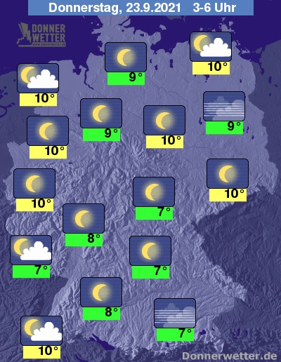 In der bevorstehenden Nacht zeigt sich der Himmel verbreitet sternenklar, hier und da können auch wenige lockere Wolken durchziehen, dazu bleibt es trocken. Die Temperatur sinkt auf 10 Grad an der Ems und bis 7 Grad an der Donau.