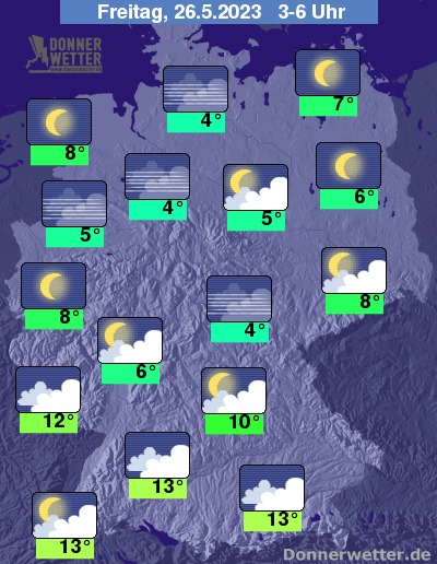 In der Nacht zum Freitag halten sich etwa südlich der Mainlinie dichte Wolken, die jedoch keinen nennenswerten Niederschlag bringen. Im großen Rest der Republik ist der Himmel locker bewölkt, zumeist aber sternenklar. Es bleibt dazu trocken bei Tiefstwerten von 13 Grad in Stuttgart und etwa 4 Grad in Hannover.
