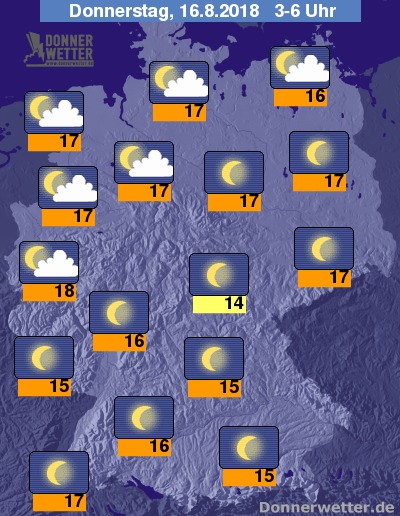 In der Nacht zum Donnerstag funkeln über dem Land die Sterne von einem meist wolkenlosen Himmel. Im Norden und Westen ziehen jedoch meist lockere Wolkenfelder durch, dazu bleibt es trocken. Die Temperatur sinkt auf 18 Grad im Rheinland und bis 14 Grad im Vogtland.