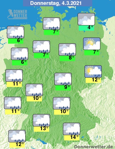 Heute ziehen von Westen her dichte Wolken durch und es fällt gebietsweise Regen oder es bilden sich einzelne Schauer. Lediglich im Südosten und Nordosten des Landes bleibt es bis zum Abend noch weitgehend trocken. Die Temperatur steigt auf kühle 4 Grad in Stralsund und bis 14 Grad in München.