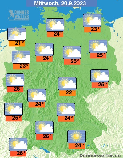 Am Mittwoch ist es verbreitet heiter oder sonnig. An der Nordsee ziehen gebietsweise einige Wolken durch, dabei bleibt es trocken. Die Temperatur erreicht 21 Grad in Cuxhaven und bis 26 Grad in Freiburg.