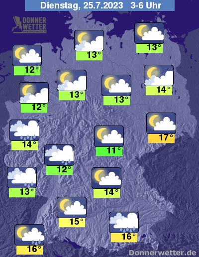 In der kommenden Nacht ist es zunächst überwiegend locker bewölkt und teils sternenklar und dazu trocken, allerdings bleibt es an den Alpen meist bedeckt und hier bilden sich weitere Schauer und örtliche Gewitter. Im Nachtverlauf ziehen dann von Südwesten kompakte Wolken auf, die nachfolgend Schauer bringen. Über der Nordosthälfte des Landes bleibt es aber weitgehend trocken. Die Temperatur sinkt auf 17 Grad in Dresden und bis 11 Grad in Jena.