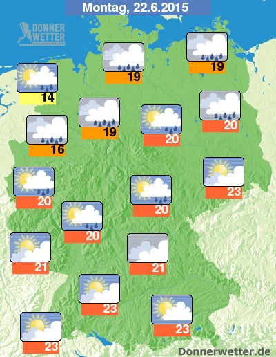 Zum Start in die neue Woche ist es anfangs bei wechselnder, teils auch schon starker Bewölkung weitgehend trocken. Im Tagesverlauf ziehen jedoch von Nordwesten her dichte Wolken mit zeitweiligem Regen auf, der bis zum Abend auch den äußersten Osten erreicht. Südlich der Donau bleibt es hingegen meist trocken. Die Temperatur steigt auf 14 Grad an der Nordsee und bis 23 Grad in München.