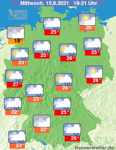 Heute Abend ist es weiterhin meist stark und hin und wieder auch mal aufgelockerter bewölkt, dazu bilden sich gebietsweise Schauer, lokale Gewitter sind ebenfalls möglich. Die Temperatur liegt bei 18 Grad in Wilhelmshaven und noch bis zu 27 Grad in Köln.