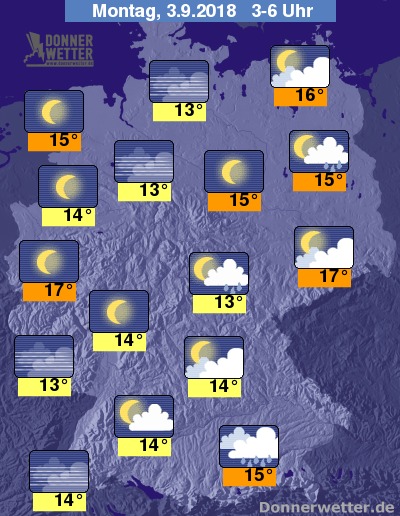 In der Nacht zum Montag bilden sich im Südosten, jedoch auch vom Thüringer Wald bis zum Erzgebirge vielerorts Schauer und einzelne Gewitter. Im Süden und Osten ist es oft locker, teils aber auch stärker bewölkt und dazu meist trocken. Im übrigen Land ist es sternenklar, dazu bleibt es trocken. Die Temperatur sinkt auf 17 Grad im Rheinland und bis 13 Grad in der Norddeutschen Tiefebene.