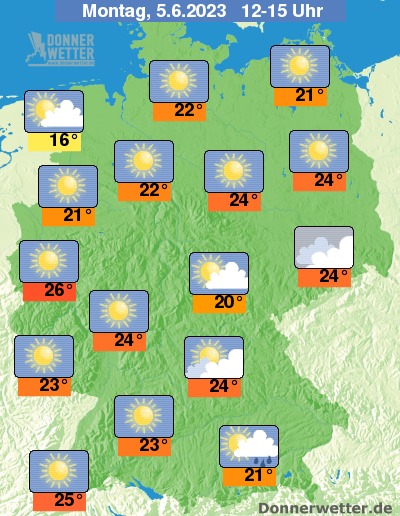 Heute Nachmittag scheint verbreitet die Sonne bei einem überwiegend wolkenlosen Himmel. Einige und zum Teil dichte Quellwolken bringen im Südosten und am Alpenrand gebietsweise Schauer und lokal auch Gewitter. Im übrigen Land bleibt es trocken bei 16 Grad an der Nordsee und 26 Grad in der Kölner Bucht.