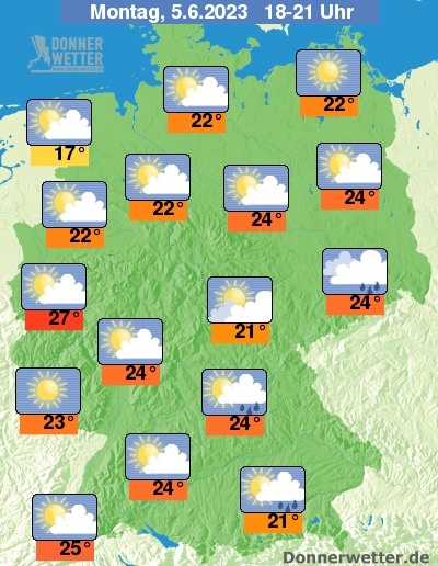 Heute Abend ist es verbreitet teils sonnig, teils locker bewölkt. Mehr und oft dichte Wolken ziehen über Sachsen und Bayern hinweg, dabei können sich einzelne Schauer, selten auch Gewitter bilden. Die Temperatur liegt bei 17 Grad in Wilhelmshaven und bis zu 27 Grad in Köln.