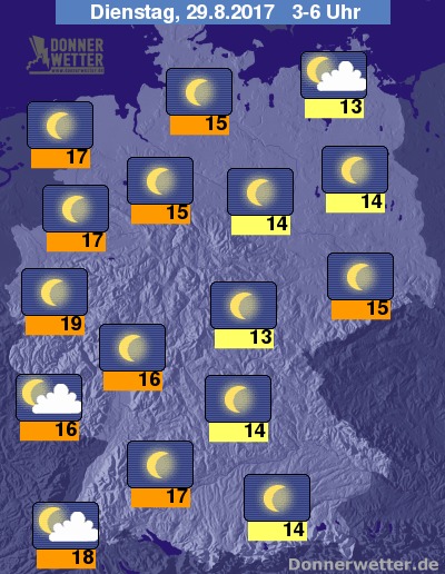 In der Nacht zum Dienstag zeigt sich der Himmel über Deutschland weitgehend sternenklar, hier und da ziehen auch mal lockere Wolkenfelder übers Land hinweg, dabei bleibt es trocken. Die Temperatur sinkt auf 19 Grad in der Kölner Bucht und bis etwa 13 Grad im Eichsfeld.