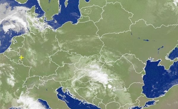Das aktuelle Satellitenbild zeigt nur lockere Wolkenfelder über Deutschland und Regenwolken über der Nordsee.