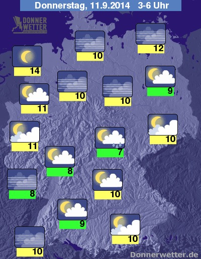 In der Nacht zum Donnerstag können sich vor allem im südlichen Sachsen-Anhalt, sowie in Thüringen gebietsweise Schauer entwickeln, sonst bleibt es dagegen vielfach locker bewölkt, häufig wird es auch sternenklar, dabei bleibt es trocken. Stellenweise bildet sich Nebel oder Dunst. Die Temperatur sinkt auf 14 Grad in Ostfriesland und 7 Grad im Grabfeld.