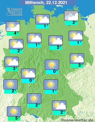Heute zeigt sich das Wetter im Süden vielerorts heiter bis sonnig, im Norden bleibt es hingegen überwiegend trüb oder stark bewölkt. Im übrigen Land ist es teils trüb, teils zeigen sich Aufheiterungen. An der Ostsee fallen hier und da einige Flocken oder Tropfen, sonst bleibt es jedoch trocken. Die Temperatur liegt bei 0 Grad im Grabfeld und bis 5 Grad am Oberrhein.
