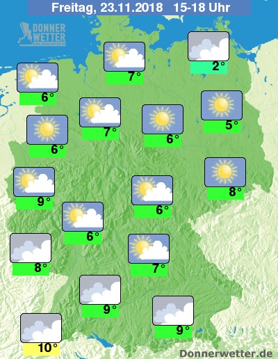 Im Laufe des Nachmittags ändert sich an der Wetter- und Temperaturverteilung nich viel, nur im Süden und Südwesten trübt sich der Himmel ein. Es bleibt jedoch bis zum Abend noch trocken.