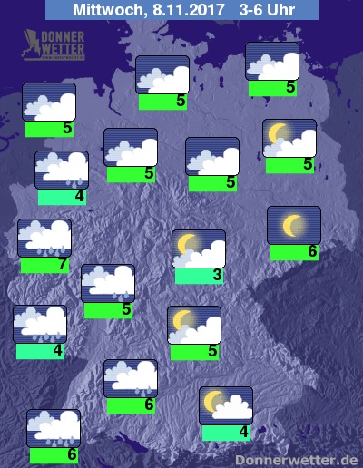 In der folgenden Nacht ziehen dichte Wolken über den Südwesten und Westen der Republik hinweg und bringen hier immer wieder Regen. Im Norden ist es zwar meist bedeckt, aber trocken, sonst ist es oft locker bis aufgelockert bewölkt, im Osten teils klar und ebenfalls trocken. Die Temperatur sinkt auf 7 Grad im Rheinland und bis 3 Grad im Thüringer Becken.