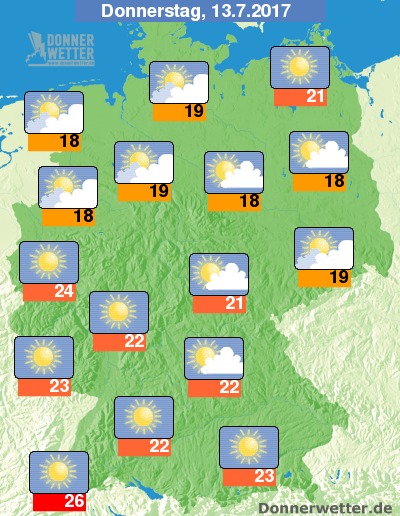 Am Donnerstag sind im Osten anfangs noch einige, teils dichte Wolken möglich, sonst ist es aber verbreitet heiter oder sonnig, hier und da können auch mal mehr Wolken durchziehen, dabei bleibt es aber trocken. Die Temperatur steigt auf 18 Grad im nördlichen Brandenburg und bis 26 Grad im Breisgau.