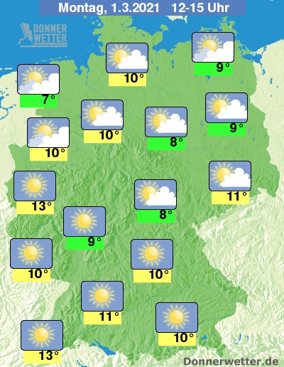 Heute Nachmittag zeigt sich das Wetter über der Südwesthälfte Deutschlands weitgehend wolkenlos. Auch über dem Norden und Osten der Republik ist es verbreitet heiter bis sonnig, hier und da sind auch mal mehr Wolken möglich, dabei bleibt es trocken. Die Temperatur liegt bei 7 Grad an der Nordsee und bis 13 Grad am Oberrhein.