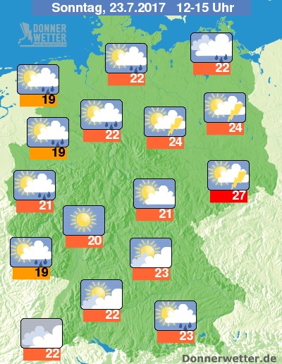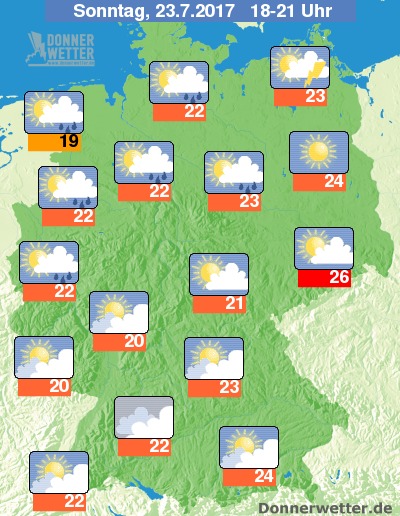 Heute Nachmittag ist es besonders über der Mitte des Landes verbreitet heiter bis sonnig und trocken. Hingegen ziehen vom Nordwesten, über den Norden bis in den Nordosten und Osten oft dichte Wolken durch, dabei sind hier zeitweise Schauer und Gewitter möglich. Auch im äußeren Südosten ist es bei oft starker Bewölkung zeitweise schaurig und gewittrig. Im übrigen Bundesgebiet ist es teils heiter, teils auch mal stark bewölkt, dabei sind aber nur einzelne Schauer möglich. Die Temperatur liegt bei 19 Grad an der Ems und bis 27 Grad in der Lausitz.