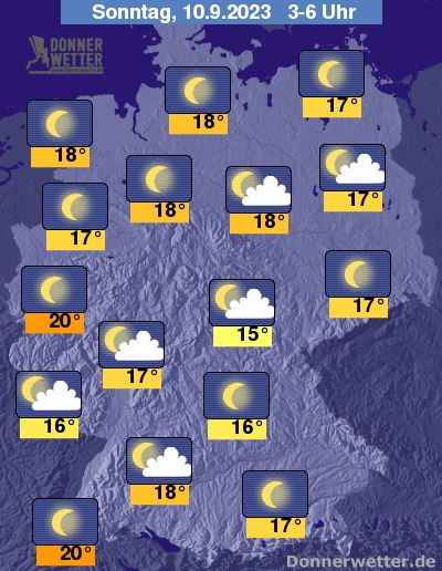 In der Nacht zum Sonntag ist der Himmel zumeist sternenklar, es kann aber auch leichte Bewölkung durchziehen, dazu bleibt es trocken. Die Temperatur sinkt auf tropische 20 Grad in Köln und Freiburg und etwa 15 Grad in Jena.