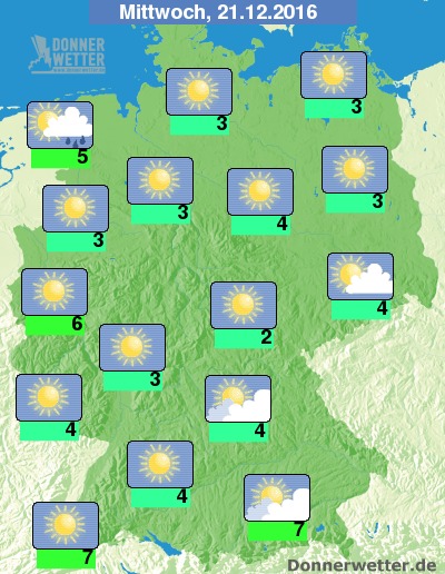 Heute bleibt es zunächst praktisch im gesamten Land heiter bis sonnig und dabei natürlich trocken, im Tagesverlauf ziehen im Nordwesten jedoch dichte Wolken nachfolgend auch Regen auf, im übrigen Bundesgebiet bleibt es jedoch trocken und größtenteils sonnig. Die Temperatur steigt auf 2 Grad im Thüringer Becken und bis 7 Grad in München.