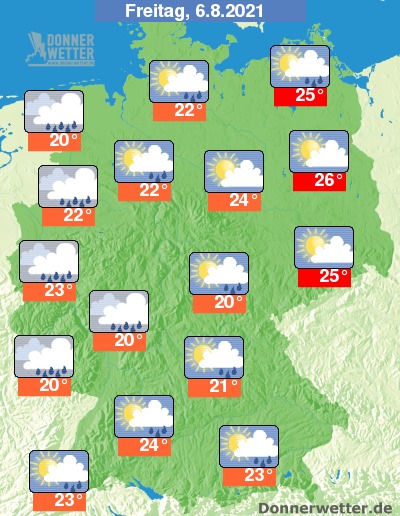 Am Freitag zeigen sich oft heitere Abschnitte, teils ziehen jedoch auch dichte Wolken durch, dabei bilden sich einzelne Schauer. Die Temperatur steigt auf 20 Grad in Wiesbaden und bis 26 Grad in Berlin.