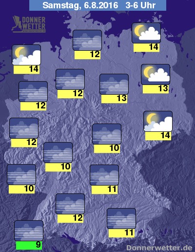 In der bevorstehenden Nacht ist es in den östlichsten Landesteilen anfangs noch oft stark bewölkt, jedoch bereits weitgehend trocken, hier lockert der Himmel erst im Laufe der zweiten Nachthälfte nach und nach auf. Im übrigen Bundesgebiet ist der Himmel verbreitet locker bewölkt oder sternenklar und es bleibt dabei trocken. Im Nordseeumfeld sind allerdings oft auch dichtere Wolken und einzelne Schauer möglich. Die Temperatur sinkt auf 14 Grad in Dresden und bis etwa 9 Grad am Bodensee.
